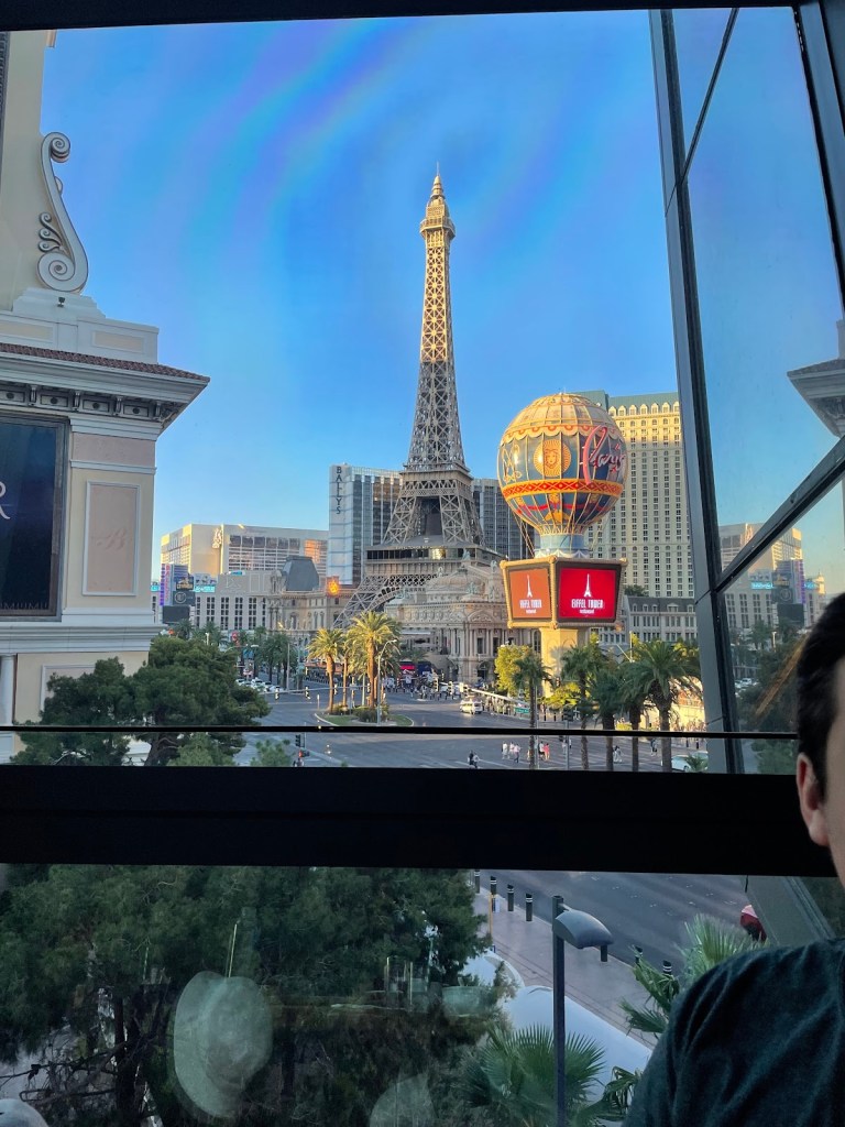 We sit down at the round table that is not just next to the window, but as the walls of the building are angled, our table is nearly over the window. We can look up, down and side to side and see an eiffel tower, a giant circus hot air balloon, a dozen billboards, and several mega screens, all the glory that is: “The Strip.”