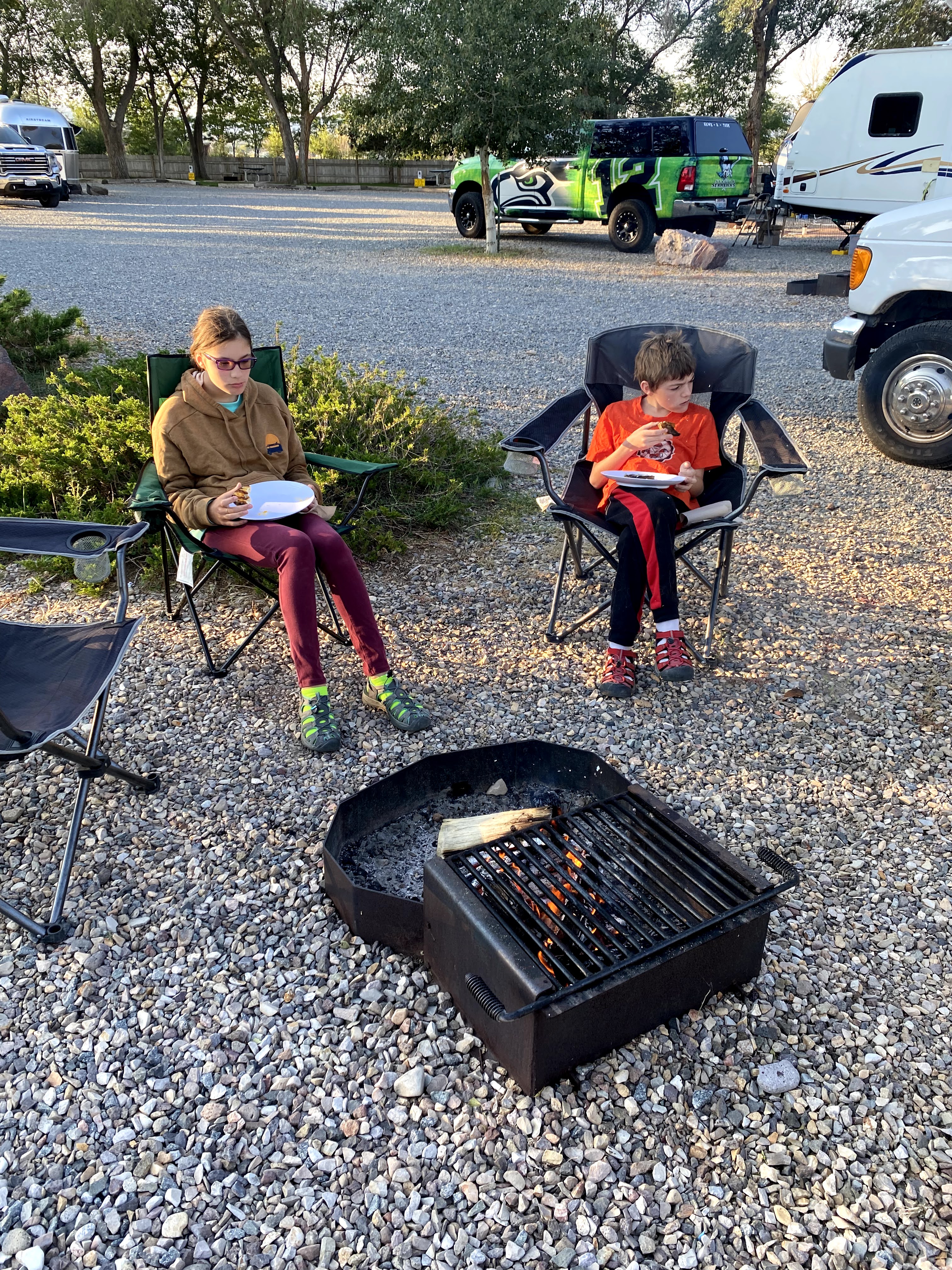 We sit around the fire eating burgers and then s’mores, glad for the firewood I’d forced the kids to carry to the car at a gas stop just a few hours before. The Utah air is cool and the park is quiet and mostly empty. This is our first day of the return journey. We have no firm plans, no reservations, nothing to accomplish, except getting home.