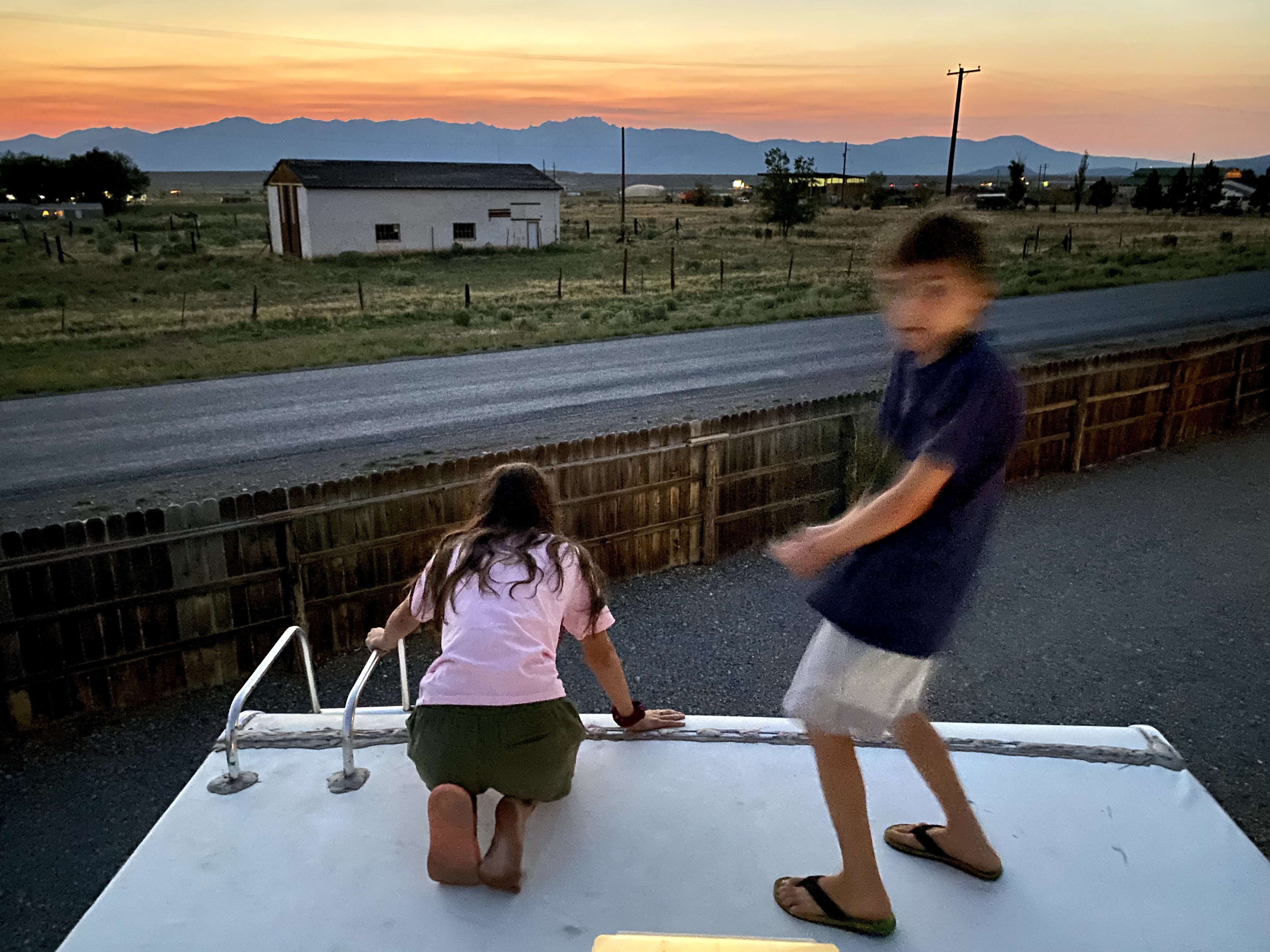 It’s still light out when we pull into the Beaver KOA Journey and fill out the after hours paperwork. We find a spot with no neighbors and decide to make dinner in the next fire pit over, so that we don’t have to look at (or possibly smell) the sewer lines from the RV on our right, where our designated fire pit is located. By day 11 we’re getting both bold and picky with our campsites. I start the fire and get the last of the burger meat from the fridge. This includes a few patties made by Max three days ago, which is the last time we had enough patience and leisure to grill. While the fire is getting hot, I climb up to the roof of the RV and beckon the others to come up and catch the sunset over the mountains. As I climb down to tend to dinner, one of Miriam’s flip flop falls off over the edge of the roof. Before I can grab it from the gravel below, Max appears around the corner and snatches it. A full blown game of keep away, boys against sister, keeps them busy until the night sky is completely dark and the burgers are ready.